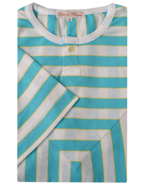Vintage Aqua Stripe T-Shirt in an aqua stripe with mitred panel on front.